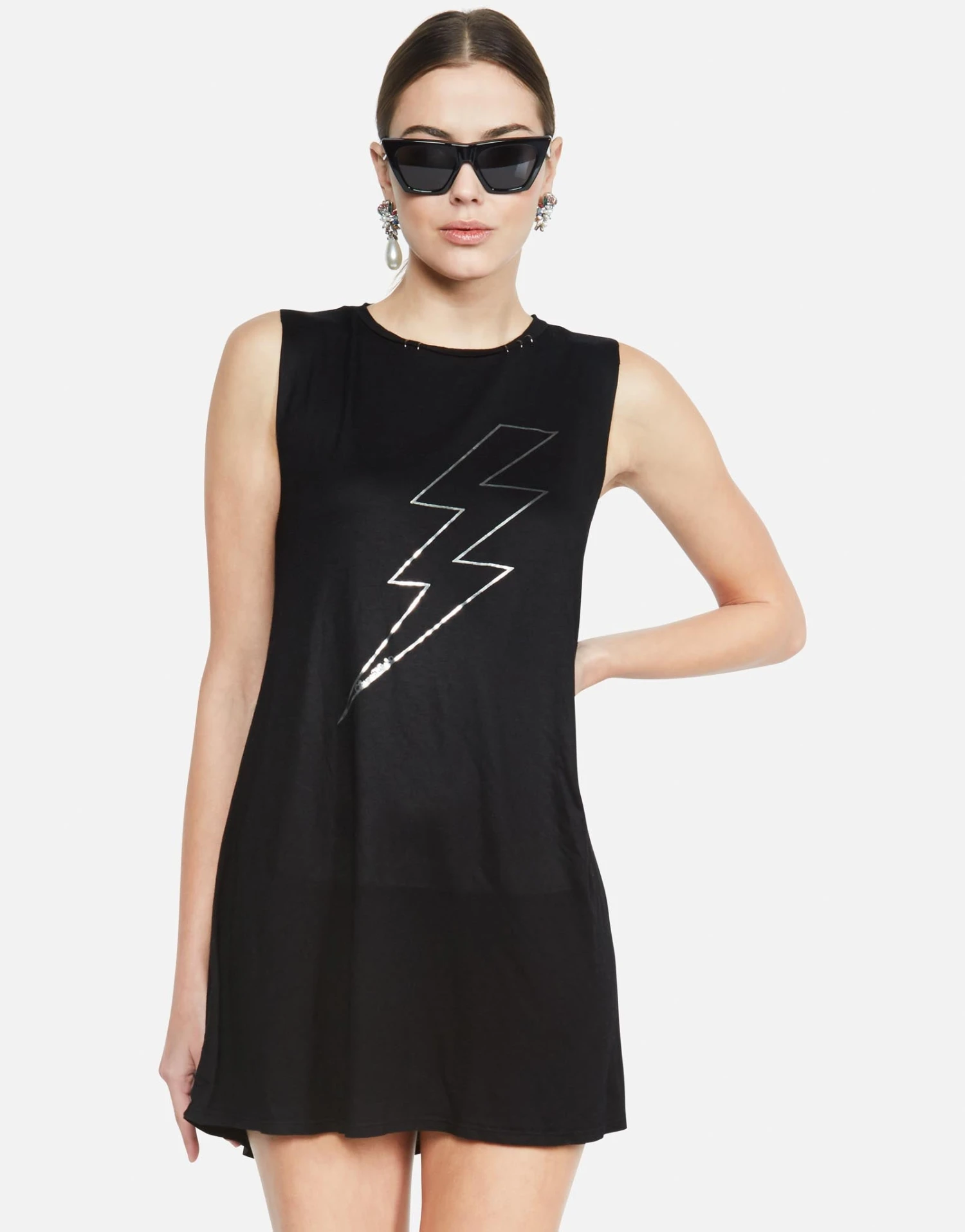 Lightning Bolt/Lightning Star Printed on Ultra Soft Lightweight Mini Dress in Black by Lauren Moshi.