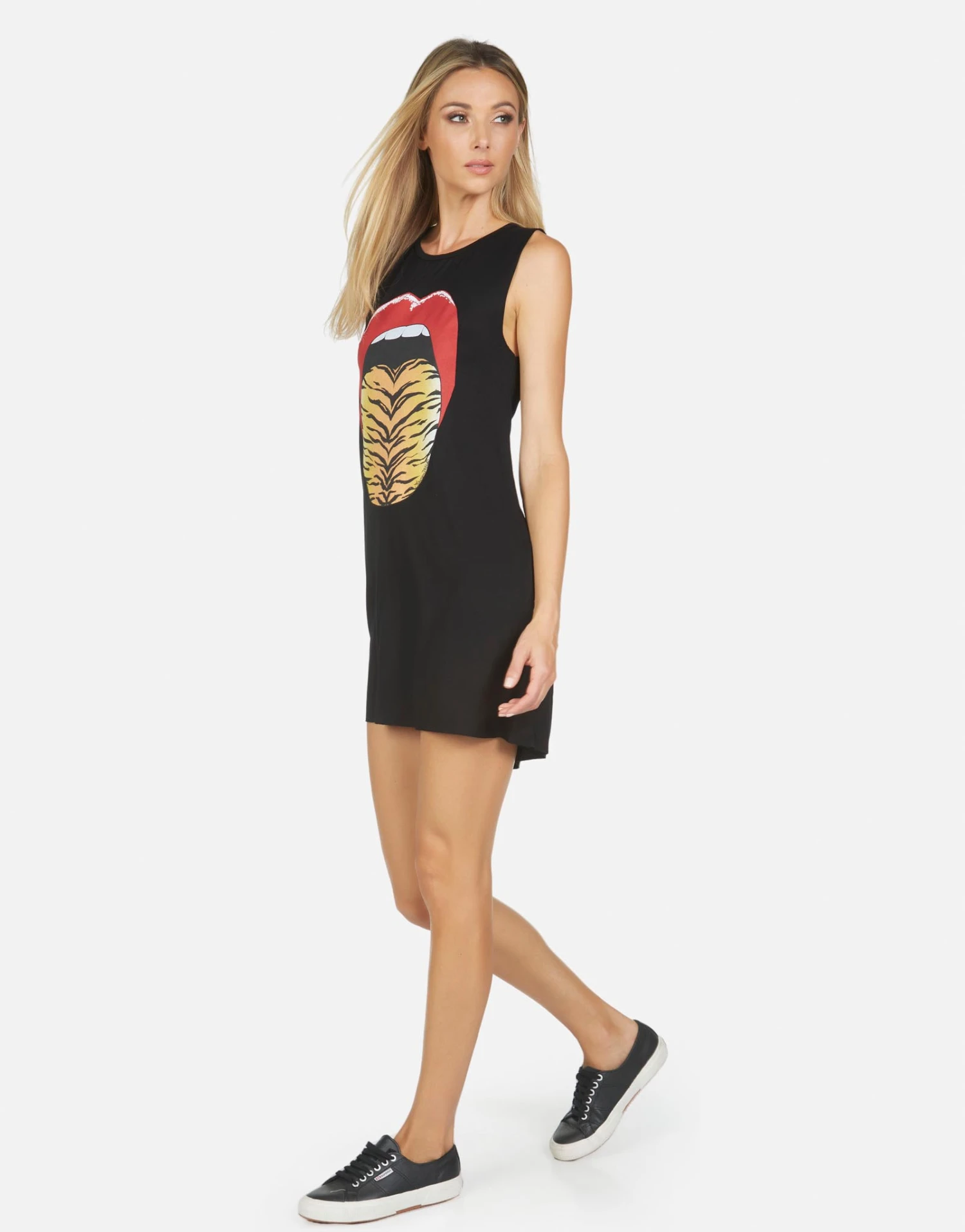Tiger Tongue Printed on Ultra Soft Lightweight Mini Dress in Black by Lauren Moshi.