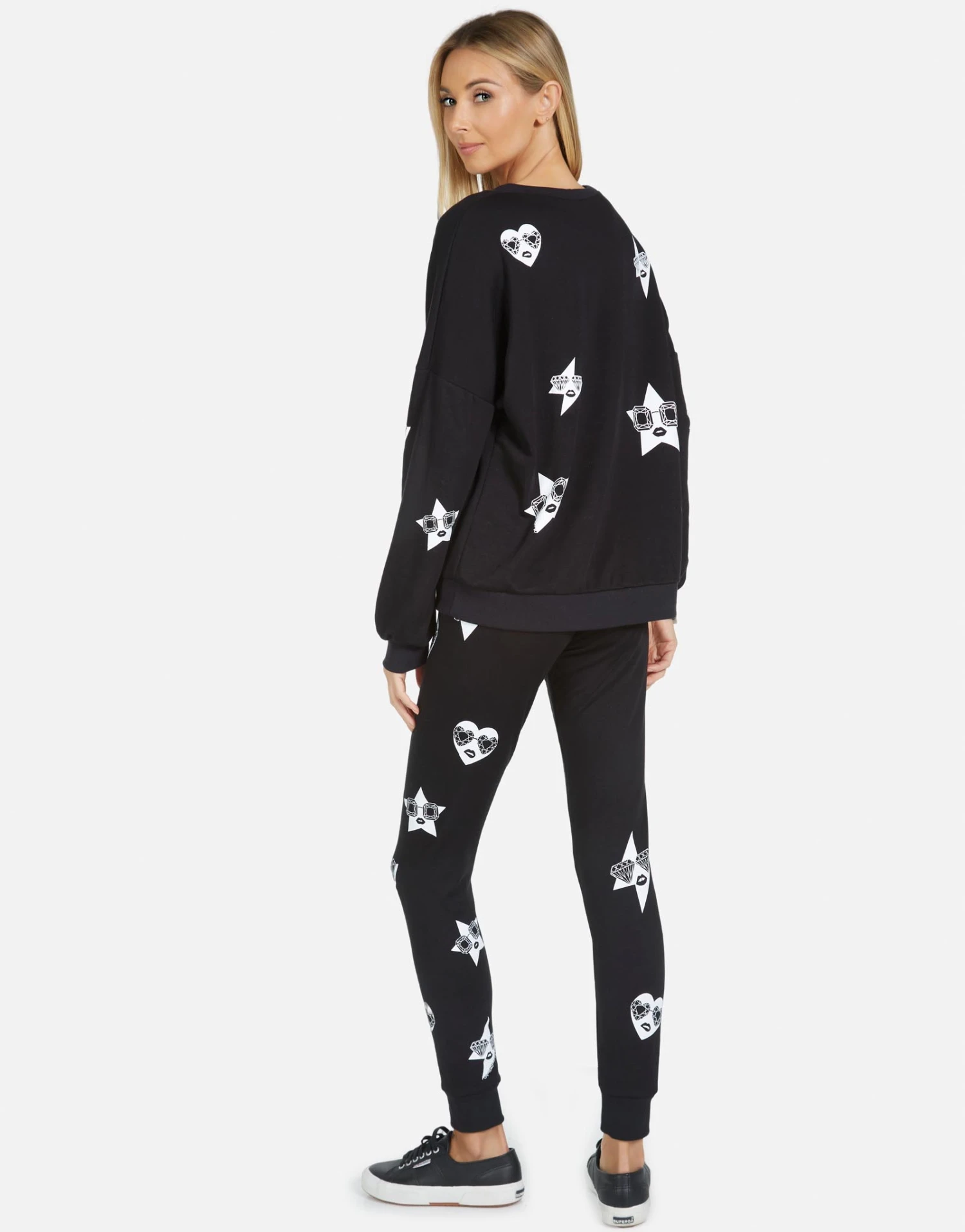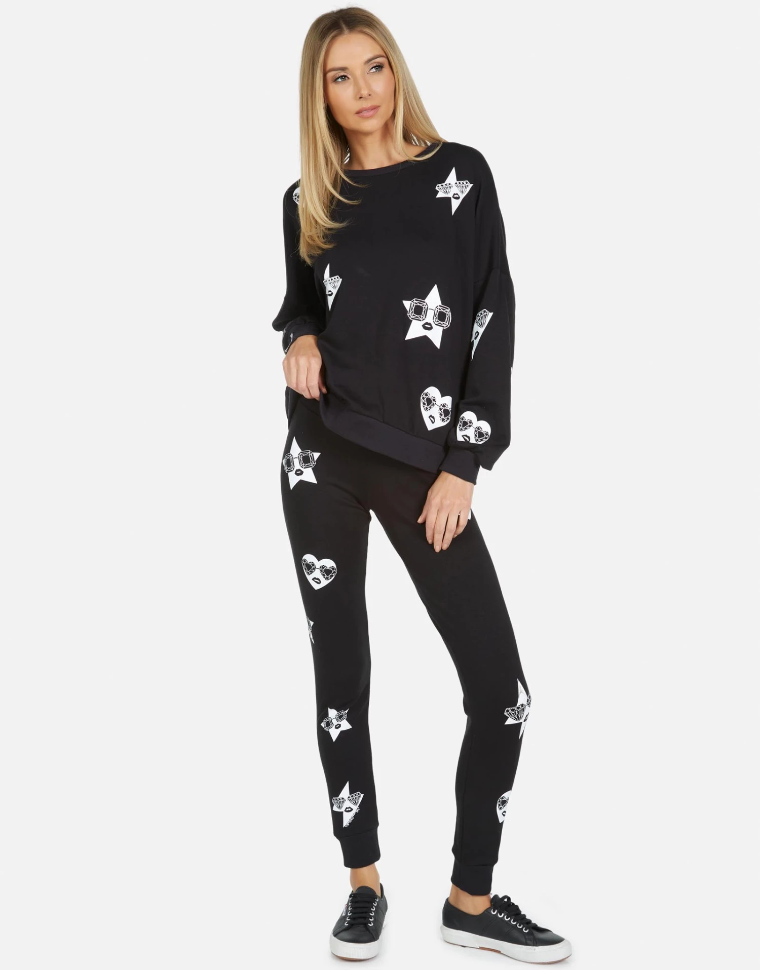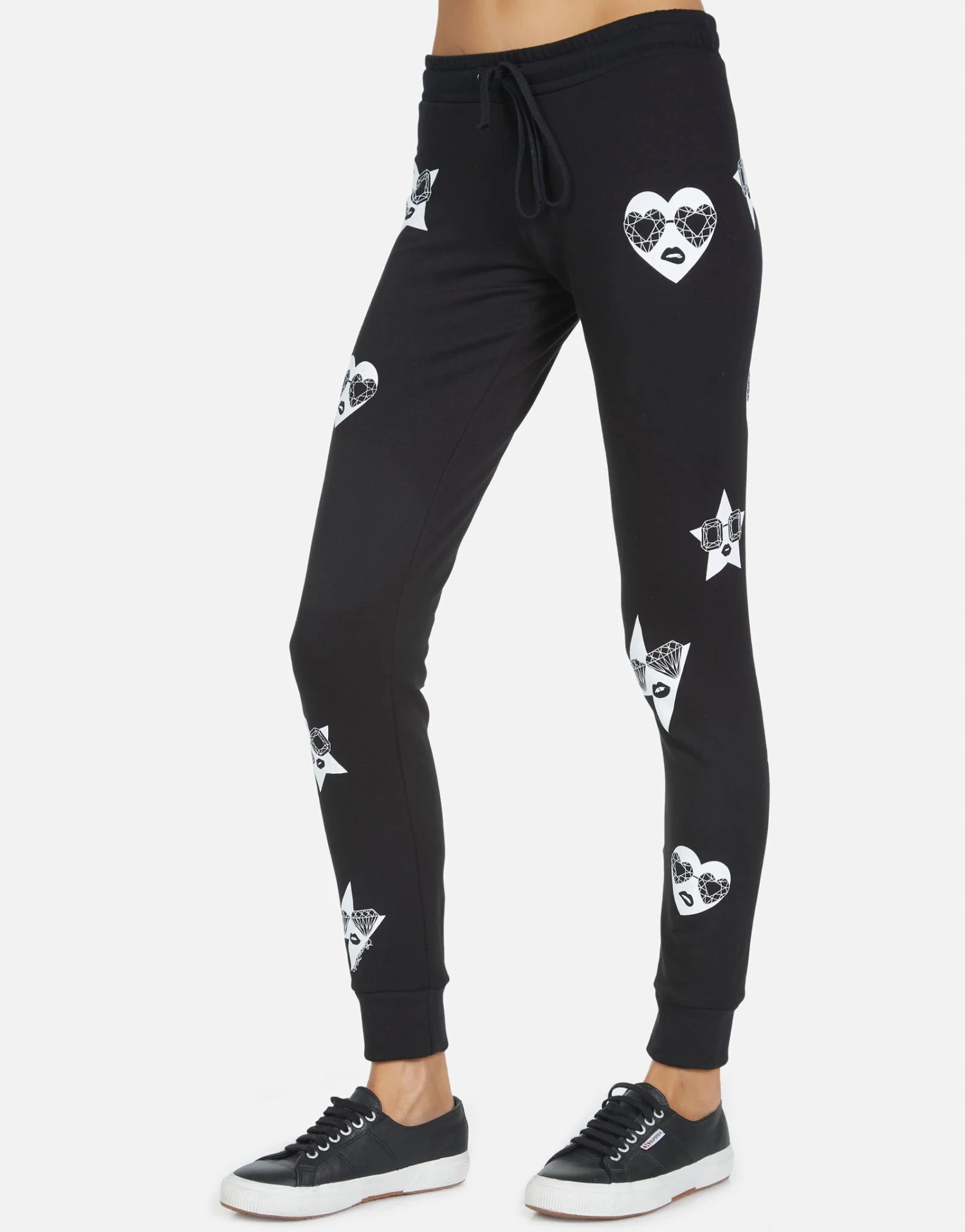 Mini Bling Faces Printed on Ultra Soft Lightweight Sweatpants w/Cuff in Black by Lauren Moshi.