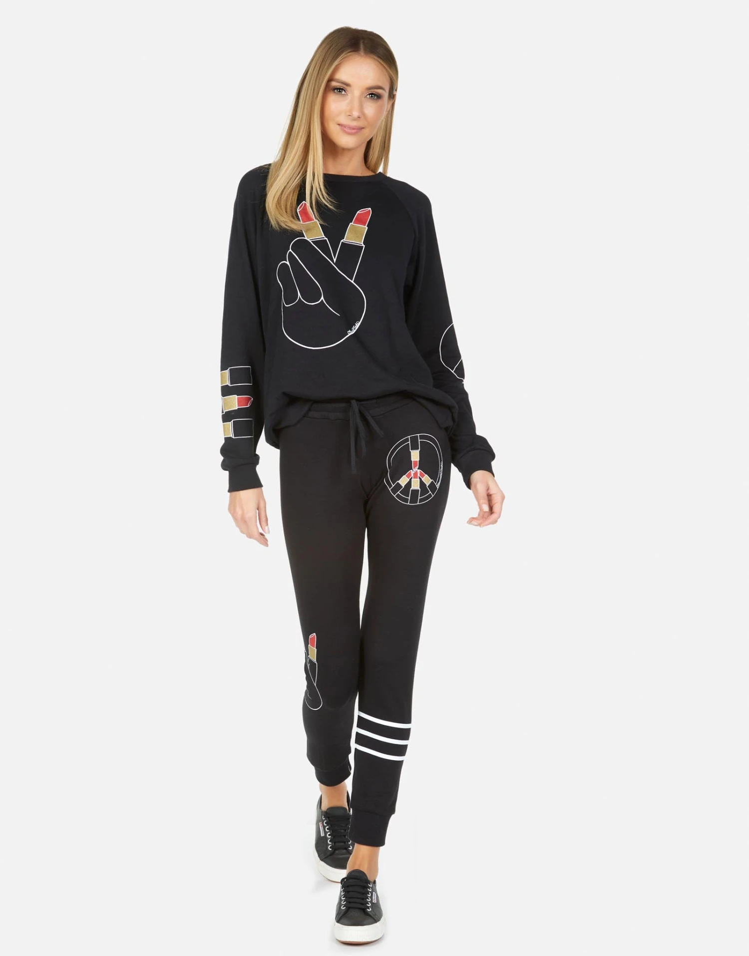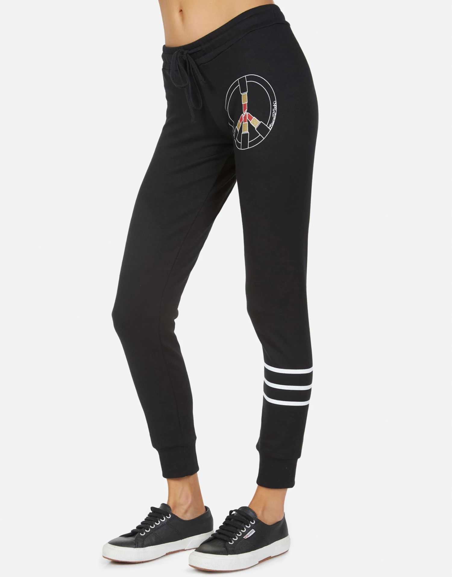 Lipstick Peace Printed on Ultra Soft Lightweight Sweatpant in Black by Lauren Moshi.