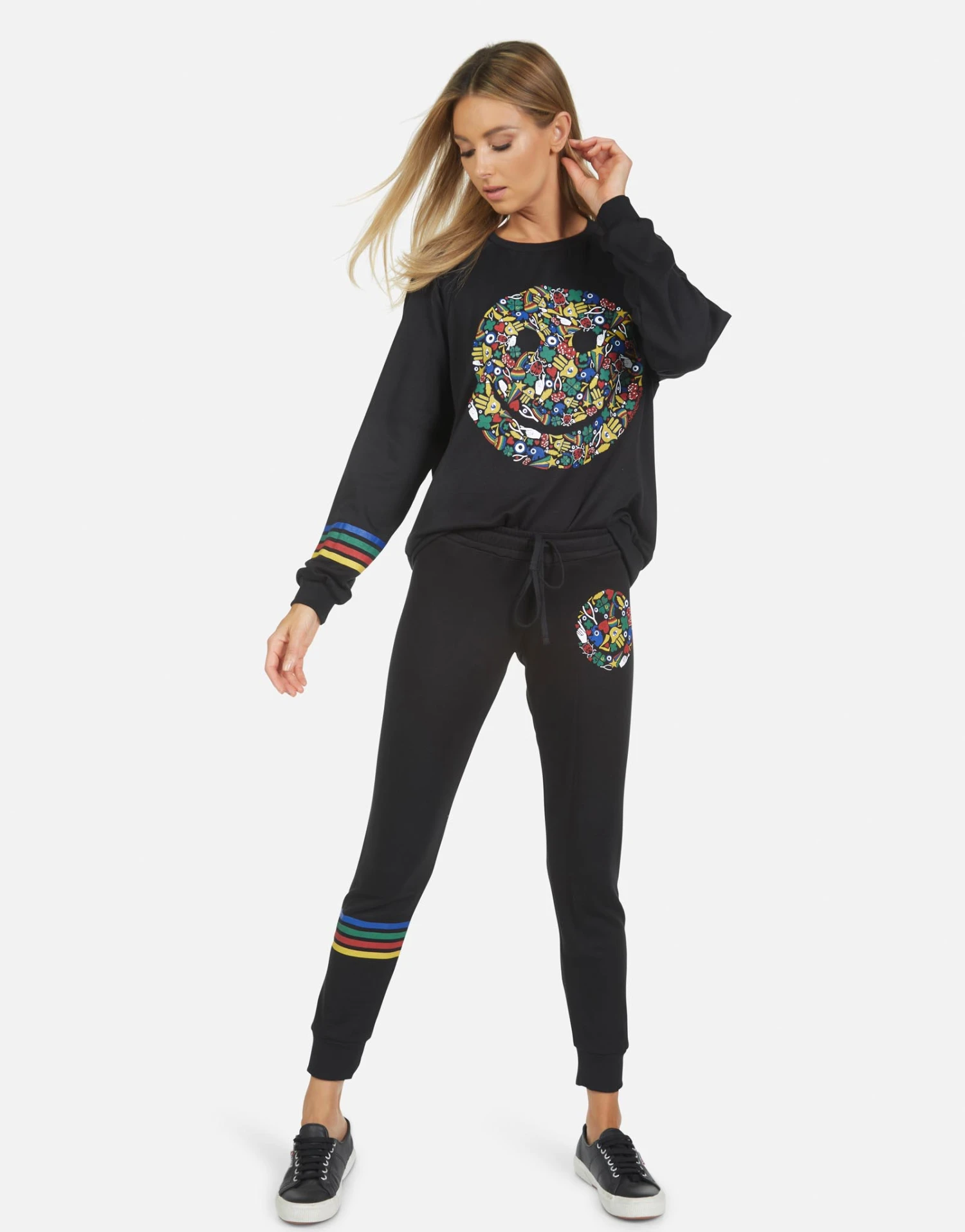 Lucky Happy Face Printed on Ultra Soft Lightweight Sweatpant in Black by Lauren Moshi.