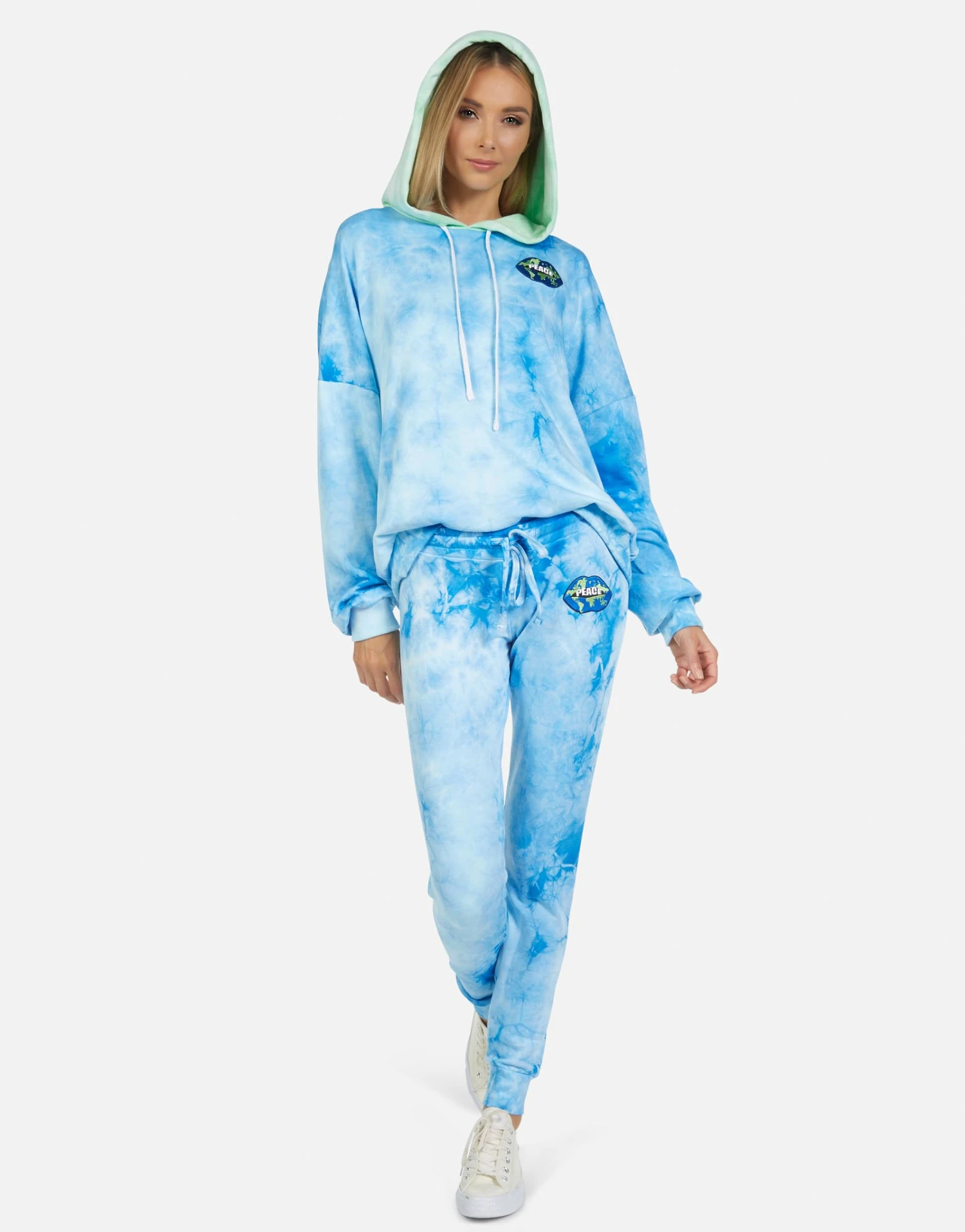 World Peace Lips Printed on Ultra Soft Lightweight Sweatpant in Blue Clouds by Lauren Moshi.