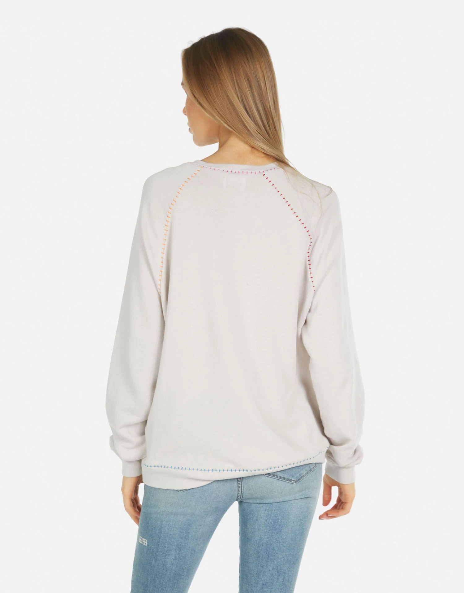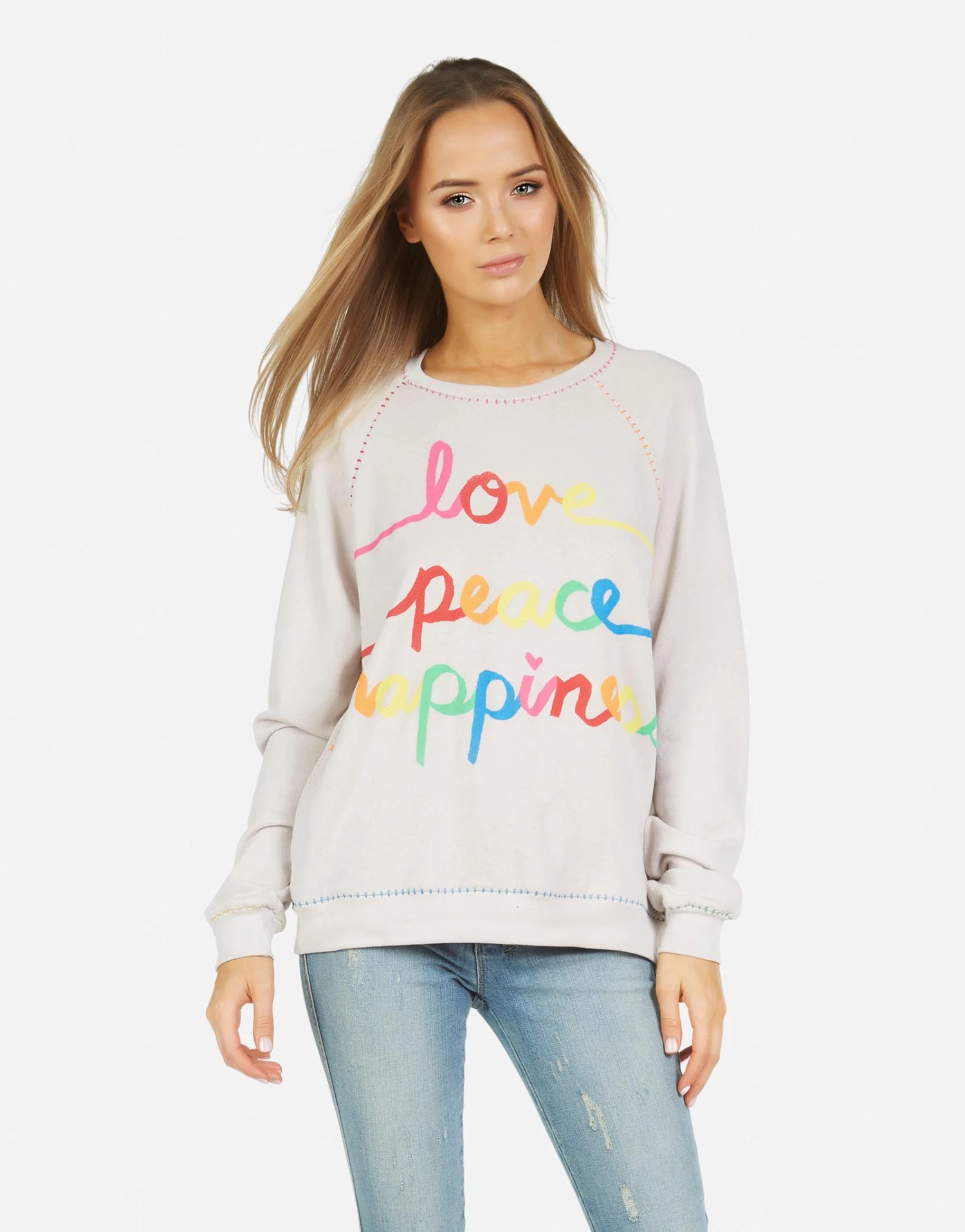 Love Peace Happiness Printed on Ultra Soft Lightweight Pullover in Cloud by Lauren Moshi.